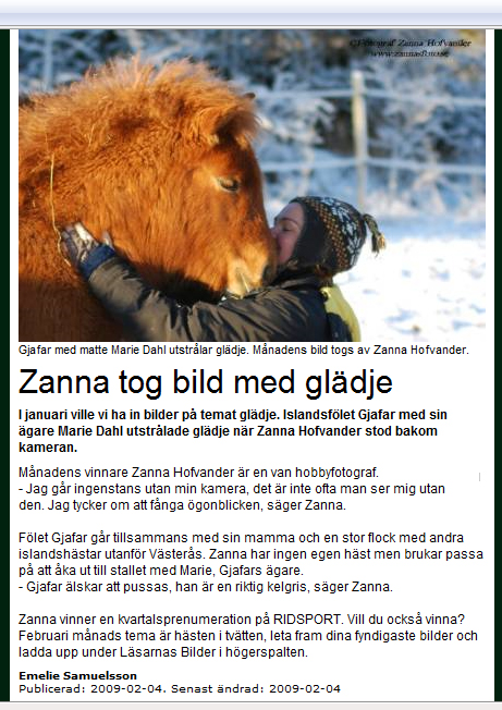 | Djurens Rätt | Årets SM-fotograf 2010 | Första plats i januari 2009, månadstävling på Tidningen Ridsport Tidningen ridsport |